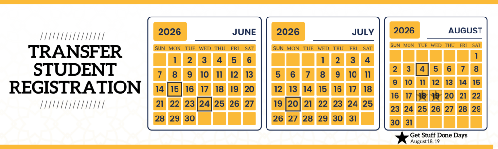 Transfer Student Registration (TSR) begins in June! Continue to work through your New/Transfer Student Checklist and come back here in May for more info. We are looking forward to meeting with you!