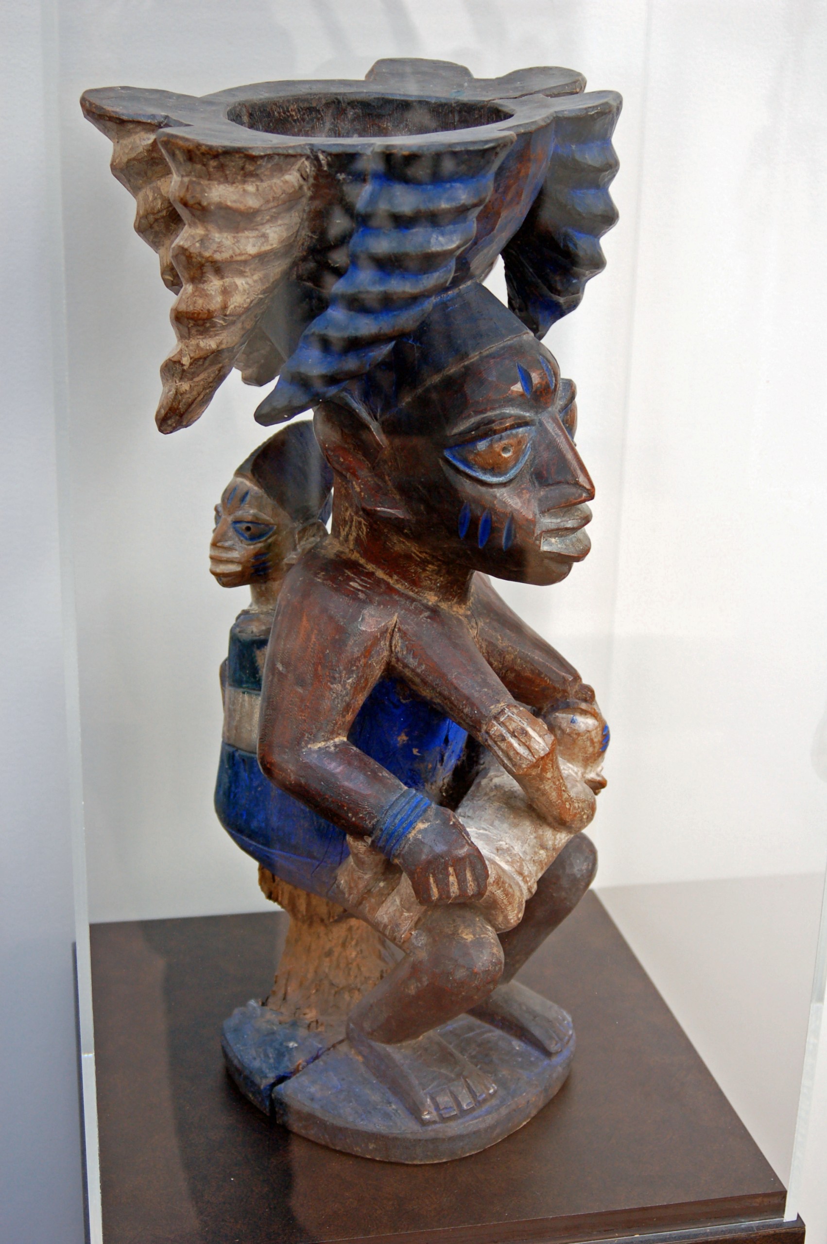 This wooden sculpture, created by an unknown Yoruba artist from Nigeria in West Africa, depicts a kneeling maternal figure with a nursing child in her arms, while carrying another child on her back. Figures created in this form are commonly called agere ifa. This term refers to any carved container that is used to store the sacred palm nuts that are an important element in the Yoruba ritual of divination. This figure balances a carved bowl on top of her head, which is where the palm nuts would be stored during the ritual.