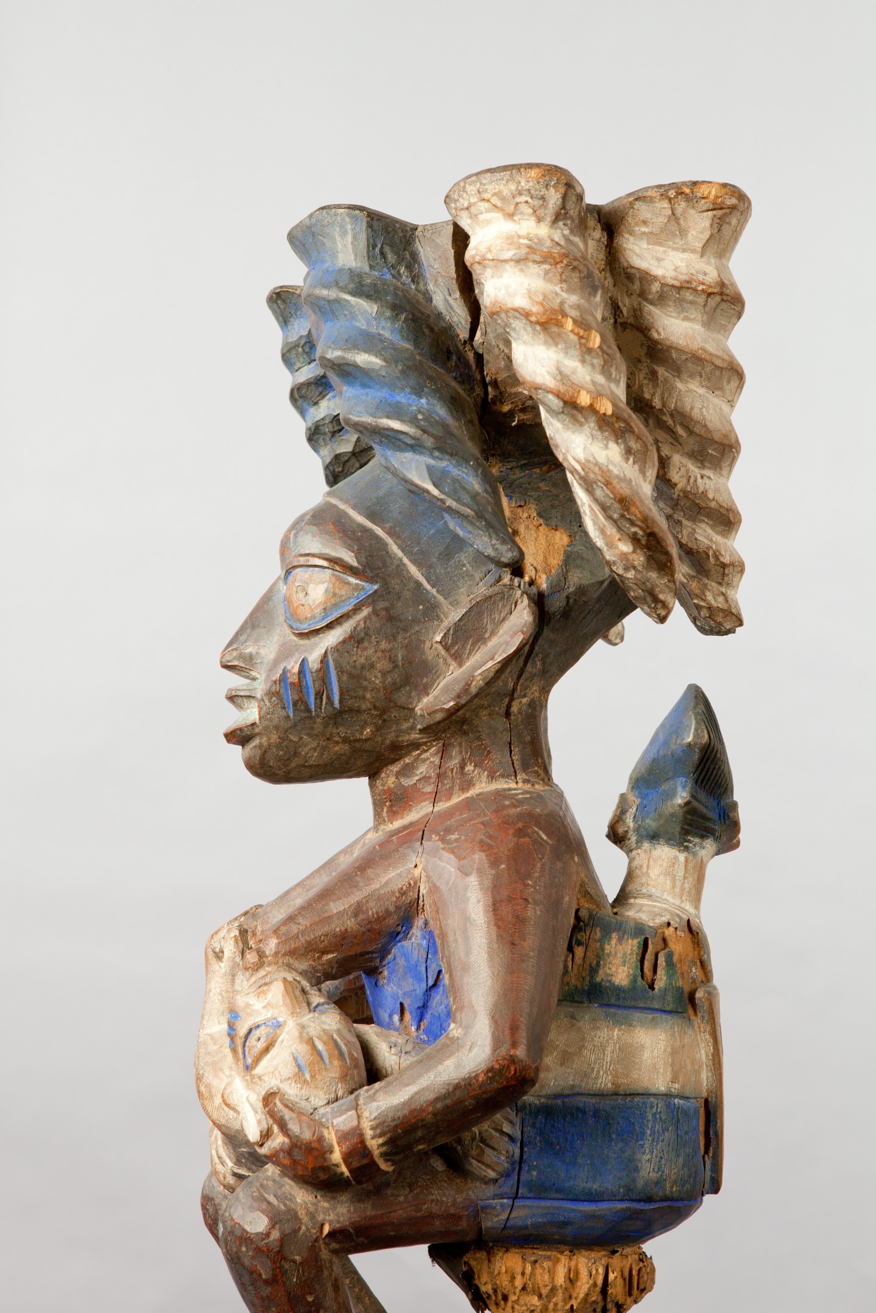 Even though this figure is not in perfect condition, this sculpture illustrates the honored role of Yoruba women as mothers. In Yoruba art tradition, mother figures are commonly depicted as nursing, holding, or surrounded by one or more children because motherhood and the ability to create new life are highly honored. Additionally, this mother figure serves as an example of how the idealized gender dynamics of the Yoruba are commonly portrayed in art. Overall, male and female Yoruba have complementary gender relations, which are fluid rather than fixed. Therefore, one gender is not seen as dominant over the other, but one gender may be more prominent in certain contexts. In the artistic context, males are traditionally much more prominent than females. Especially in the art of woodcarving, which is considered the most important art form among the Yoruba.