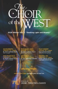 Our tour program is titled “Seeking Light and Beauty“, with musical evocations of themes of strength, hope, healing, and joy. The 30-voice ensemble will feature works by Felix Mendelssohn, Johannes Brahms, Susan LaBarr, PLU alum T.J. Wheeler, Joan Szymko, Hans Bridget Heruth, Brian Galante, J.A.C. Redford, Ryan O’Neal, and Stephen Sondheim. We will be joined by mezzo soprano and Associate Professor of Music Soon Cho, and collaborative pianist Amy Boers.
