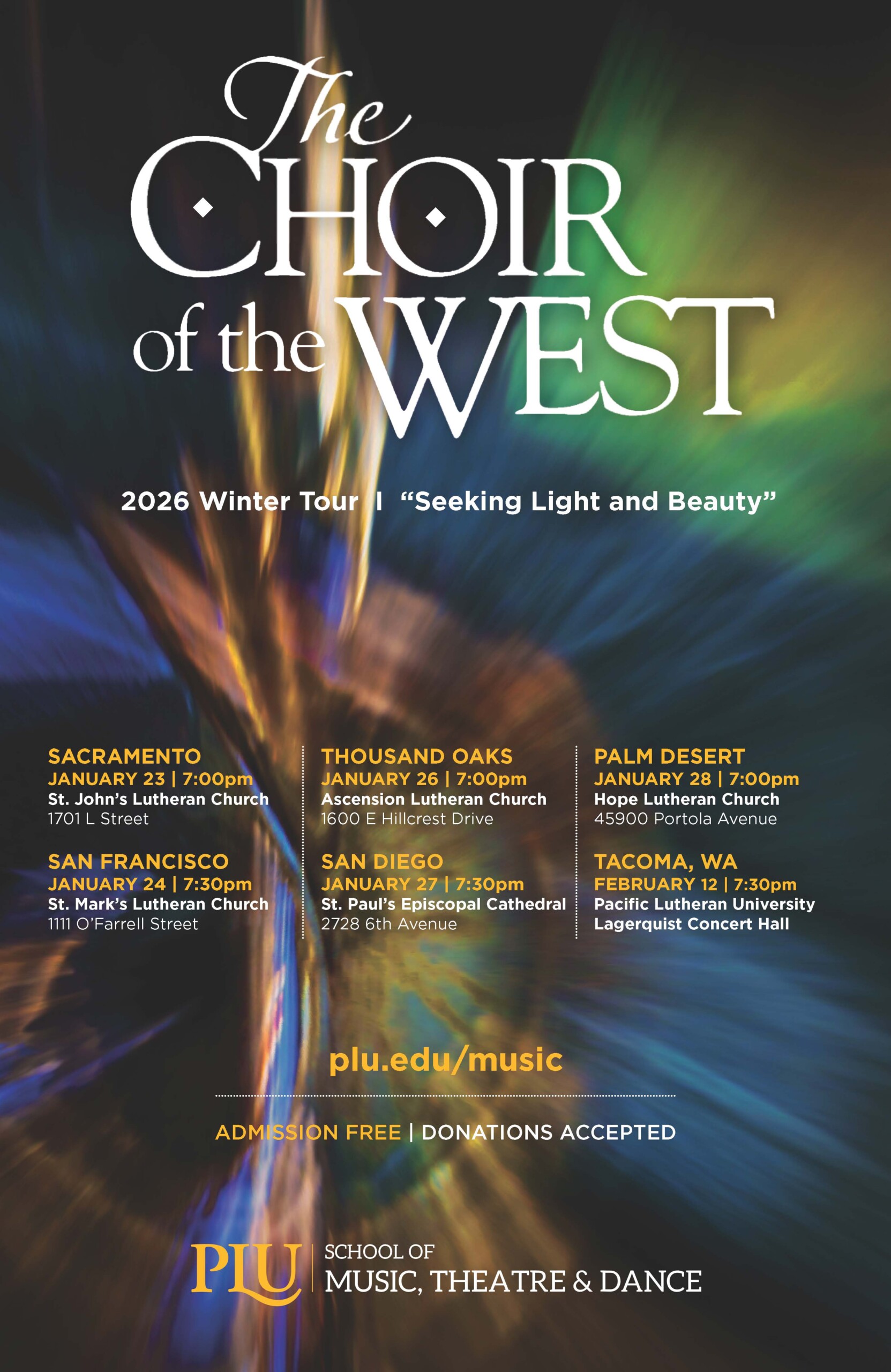 We are delighted to announce that the Pacific Lutheran University Choir of the West will be on tour in California in late January!