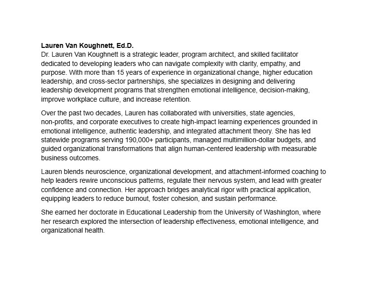 - Lauren Van Koughnett, Ed.D. Strategic leader and program architect with 15+ years of experience in leadership development, organizational change, and emotional intelligence research and application.