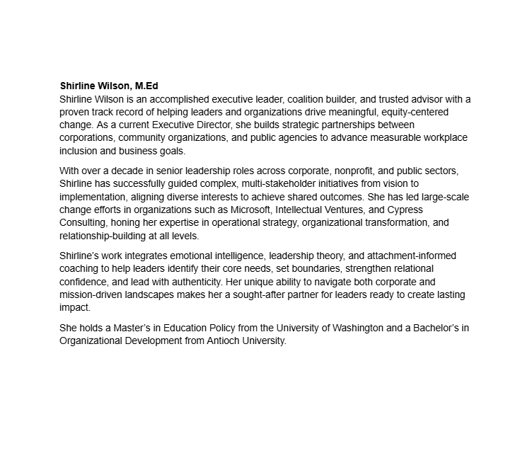 - Shirline Wilson, M.Ed. Accomplished executive leader and coalition builder with experience across corporate, nonprofit, and public sectors, integrating emotional intelligence, leadership theory, and attachment-informed coaching.