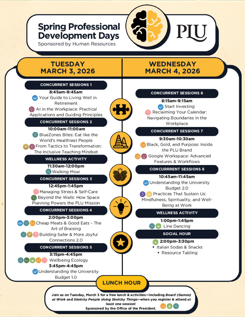 Highlights: Morning sessions followed by a wellness activity and a Social Hour (2:00 PM – 3:30 PM). Explore campus resources while enjoying refreshments with the PLU community.