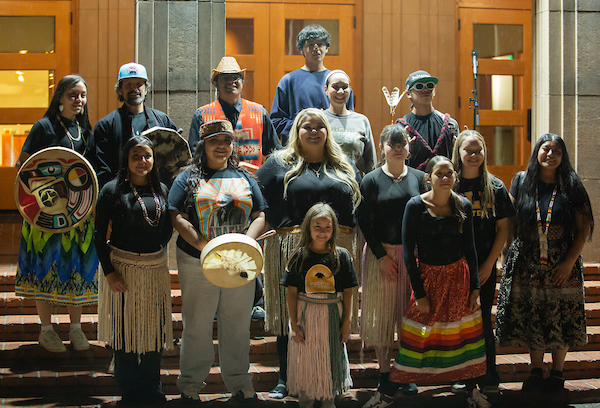 Nisqually and Puyallup tribal members, along with Chief Leschi students, lead a Jam session with drumming, song and dance, Thursday, Sept. 26, 2024, in Red Square at PLU. (PLU Photo / Joseph Middleton).