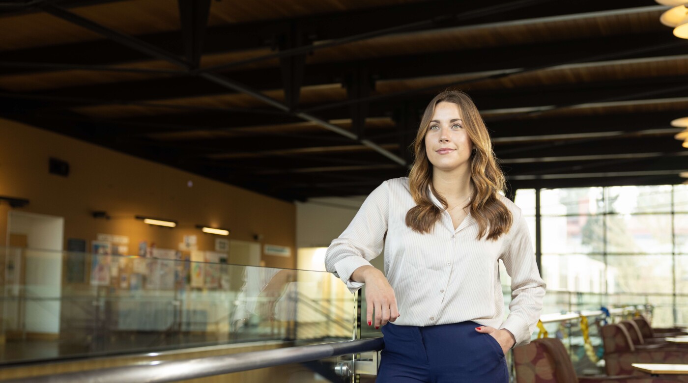 Image: Carmen Kiewert in Morken, where she spent a lot of her time as a business major. Kiewert is also part of the Regents Investment Club, a DECA award recipient, and a member of the women’s soccer team. (PLU Photo / Sy Bean)