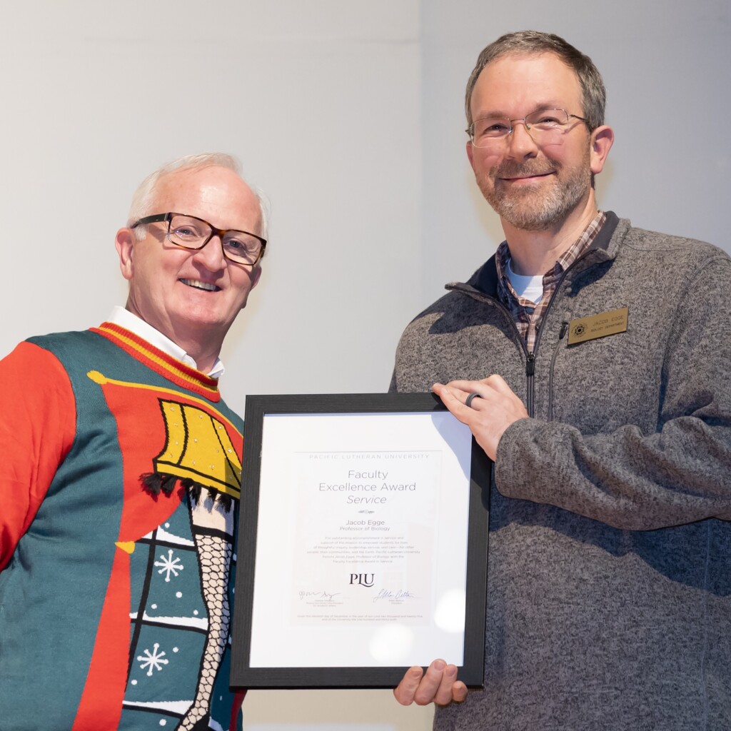 For his extraordinary leadership in faculty governance, his selfless commitment to protecting and sharing scientific resources, and his deep service to the wider community, we honor and congratulate Dr. Jacob Egge with the Faculty Excellence Award in Service.