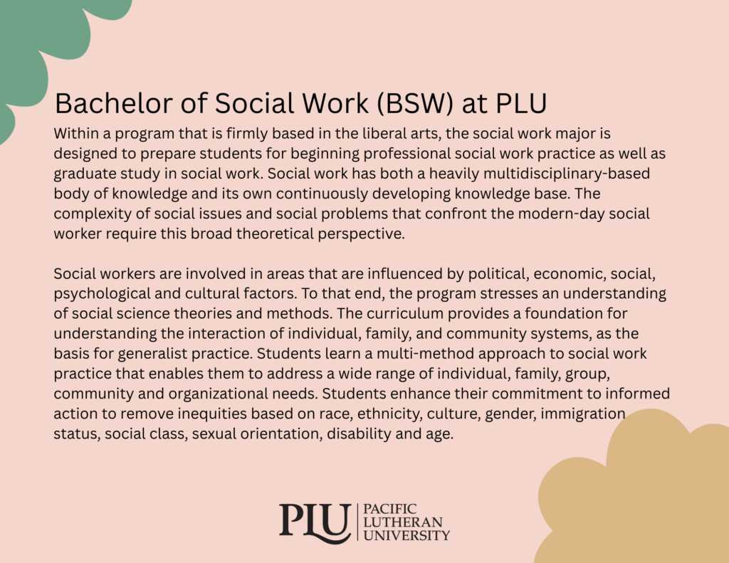 The B.A. in Social Work at Pacific Lutheran University is designed to prepare individuals for entry-level generalist social work practice. The social work curriculum is based on an integrated, developmental approach to learning and reflects a national consensus on social work education. Each course counted in the Social Work major must be completed with at least a C-.