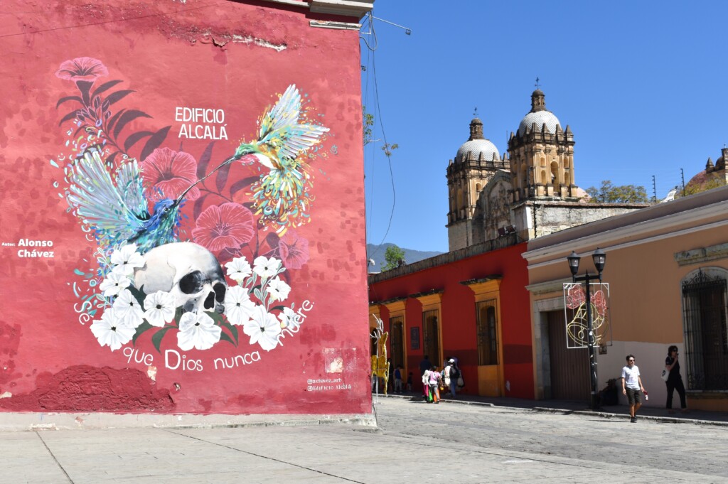 This mural in Oaxaca depicts hummingbirds—sacred symbols associated with Huitzilopochtli, the Aztec god of war and the sun—blending Indigenous belief systems with contemporary urban art. By pairing the birds with a skull and flowers, the composition evokes themes of life, death, and rebirth, reflecting Mesoamerican understandings of mortality and spirituality while situating these ancient symbols within a modern cityscape near a church to contrast the ancient belief systems with the new.