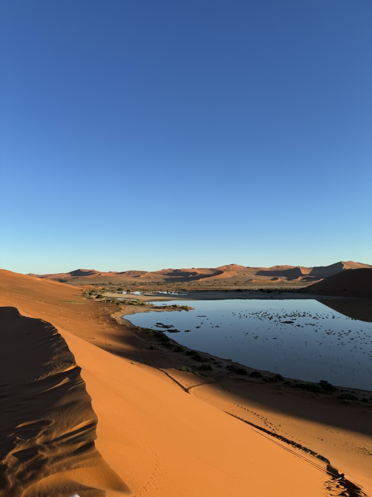 This place blew my mind. My photo doesn’t even do it justice. Last year Namibia experienced above-average rainfall, with torrential downpours that caused the deserts to stay green for longer than usual. When we hiked “Big Daddy Dune” we got to see an oasis from above!