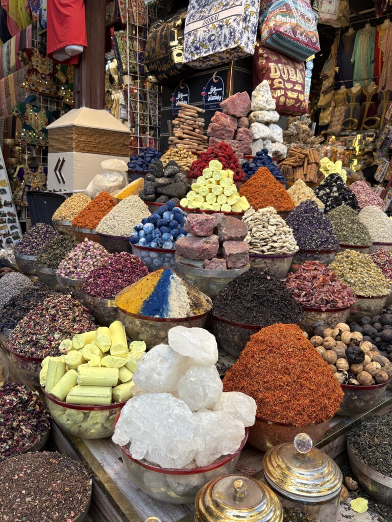 Dubai’s traditional markets are called souqs and they are named for the products they sell: the gold souq, the textile souq, the utensil souq, and as shown here, the spice souq. Walking through the souq is a sensory feast. There are bright colors, loud sounds, constant brushes from the flowing crowd, and from every stall, a bouquet of swirling smells. The colorful spices are stacked outside each booth and every vendor is eager to soothe your soul with herbal tea or completely clear your sinuses with a whiff of eucalyptus crystal.