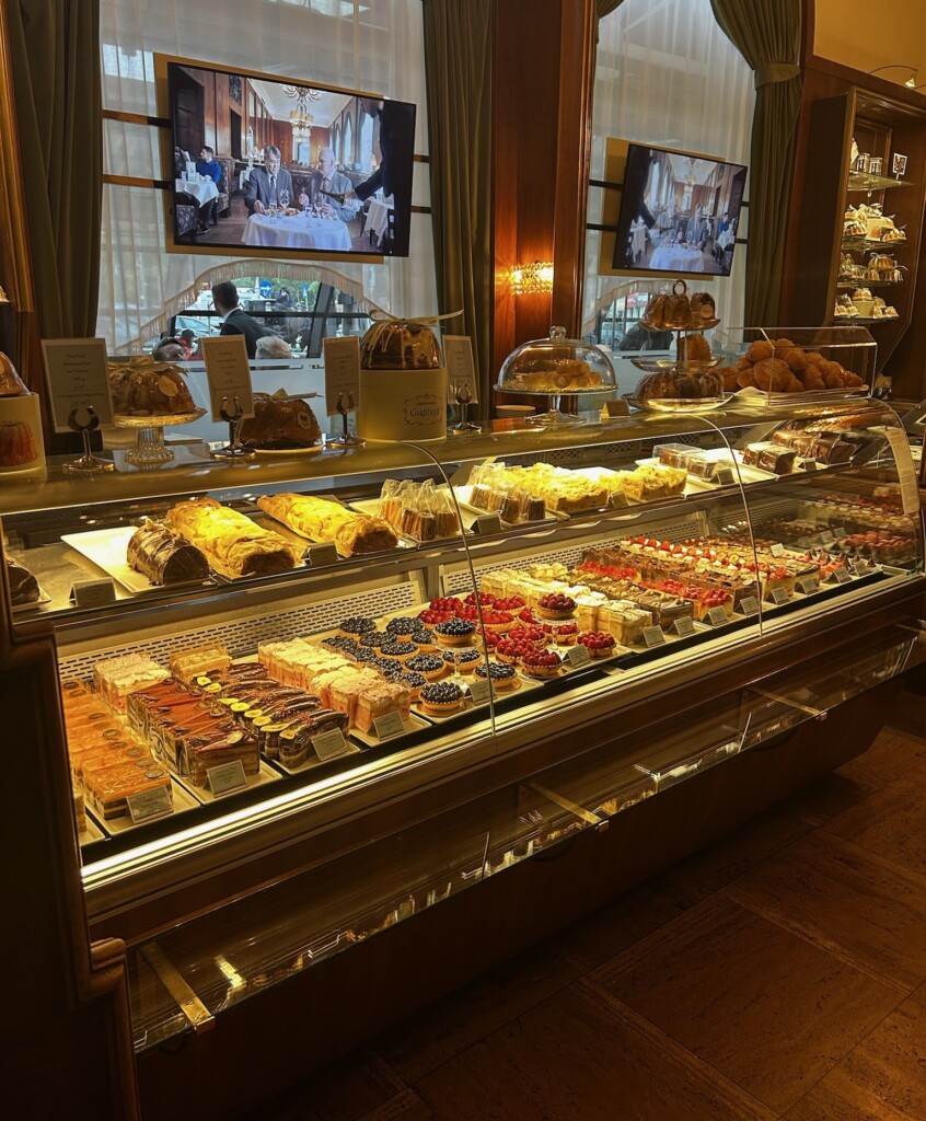 A cake and pastry case at Café Landtmann, a historic coffee house in Vienna.